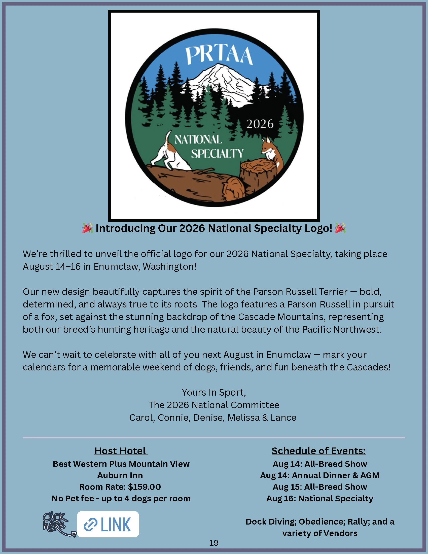 Join us as we move to the western half of our beautiful country to see the best of the best at the 2026 PRTAA National Specialty. With a large venue and plenty of space for all of our favorite dog sports, Enumclaw promises not to disappoint! Enumclaw is only 32 miles from Seattle and