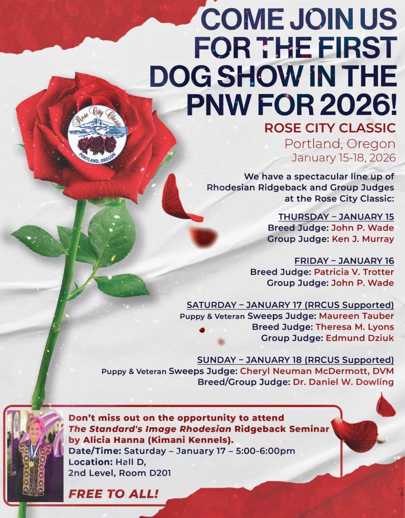 The Rose City Classic Series of Dog Shows is one of the largest and most popular dog events in the United States. That’s why so many of the best dogs in America and even dogs from foreign countries travel to Portland each January to compete. The event spans 5 days, starting on Wednesday with several Individual breed specialty shows and an all-Terrier group show. These specialty events are put on by local AKC dog clubs organized for the improvement and preservation of a particular breed or group.