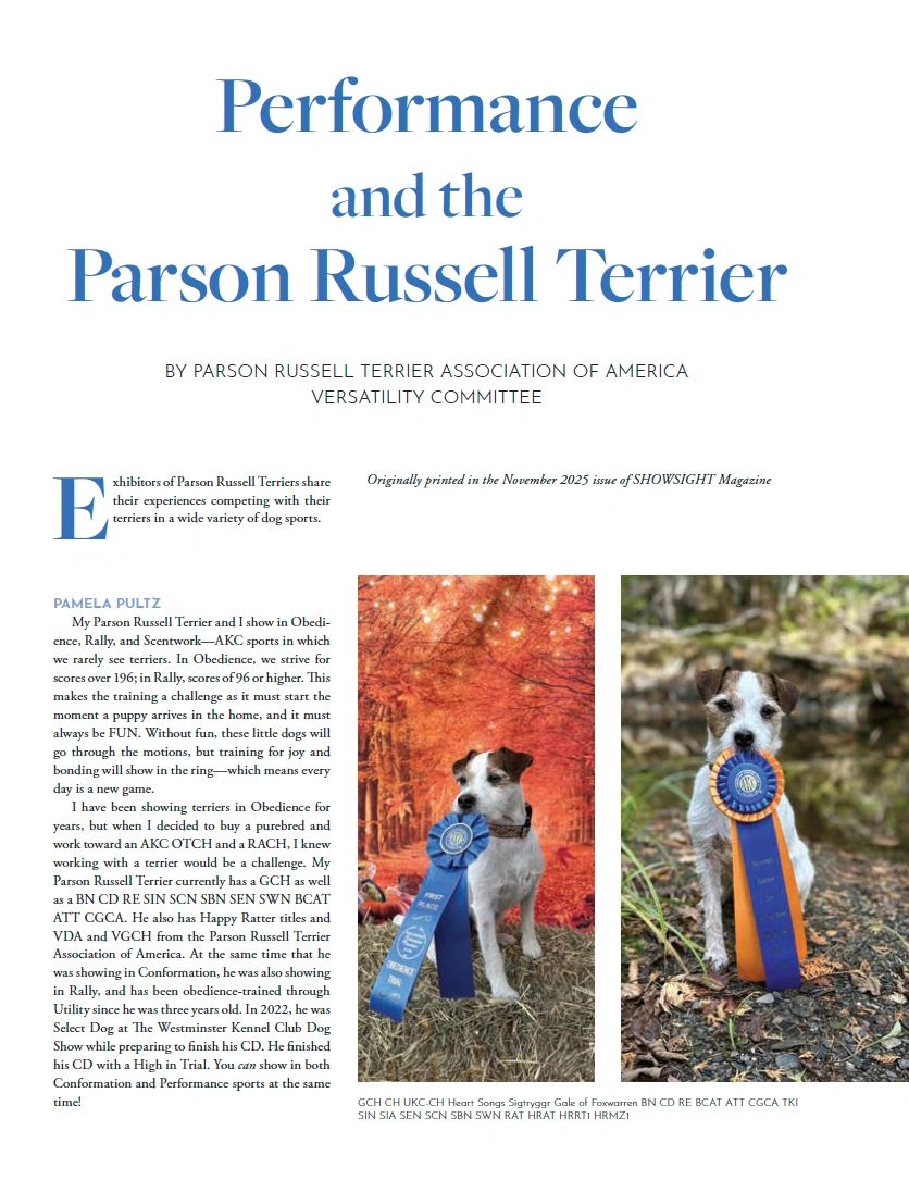 To be titled a Versatile Parson Russell Terrier, the dog must achieve points and titles in multiple activities.